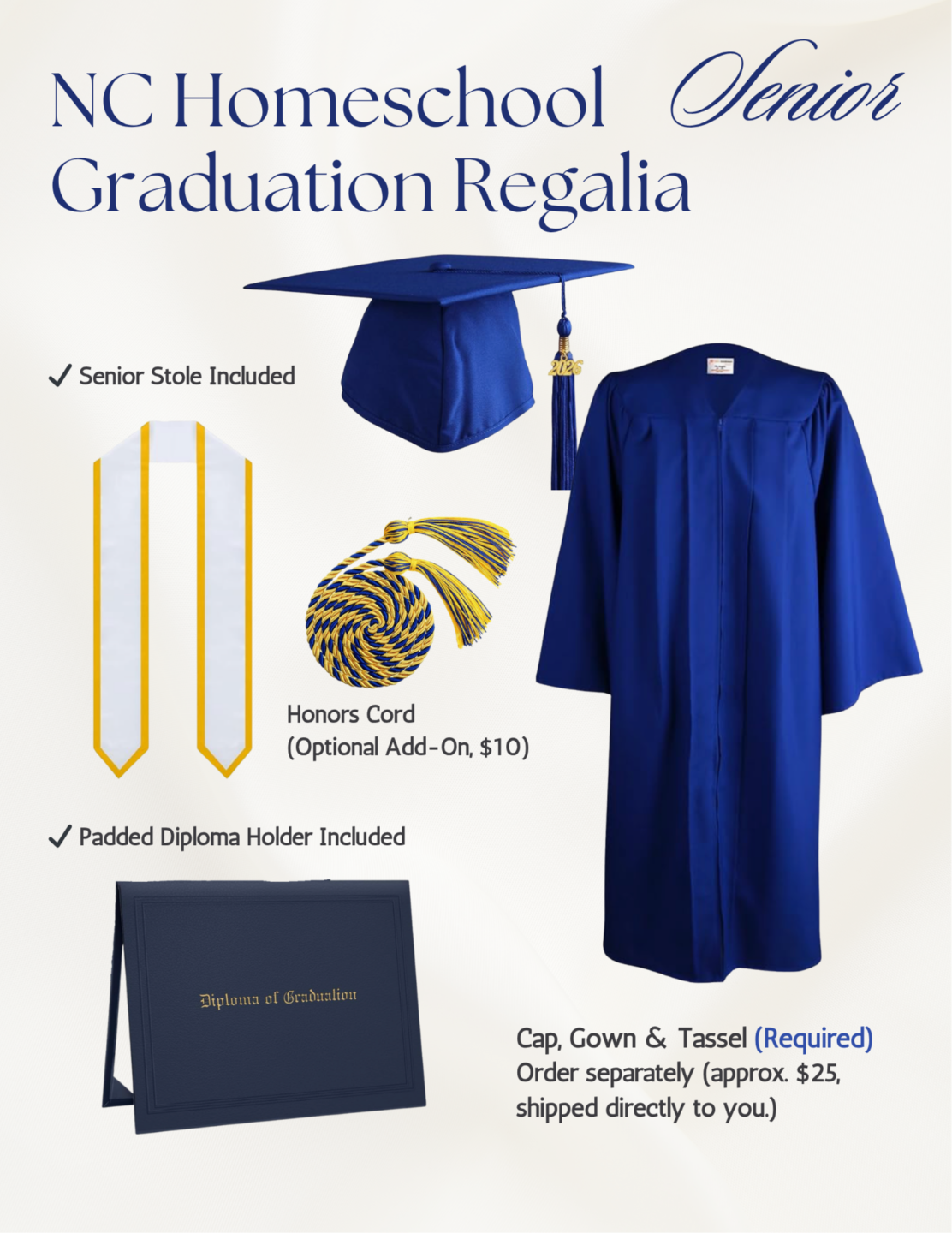 Cap, gown, and tassel are REQUIRED and NOT included (~$25). You will receive a link to order them upon checkout.