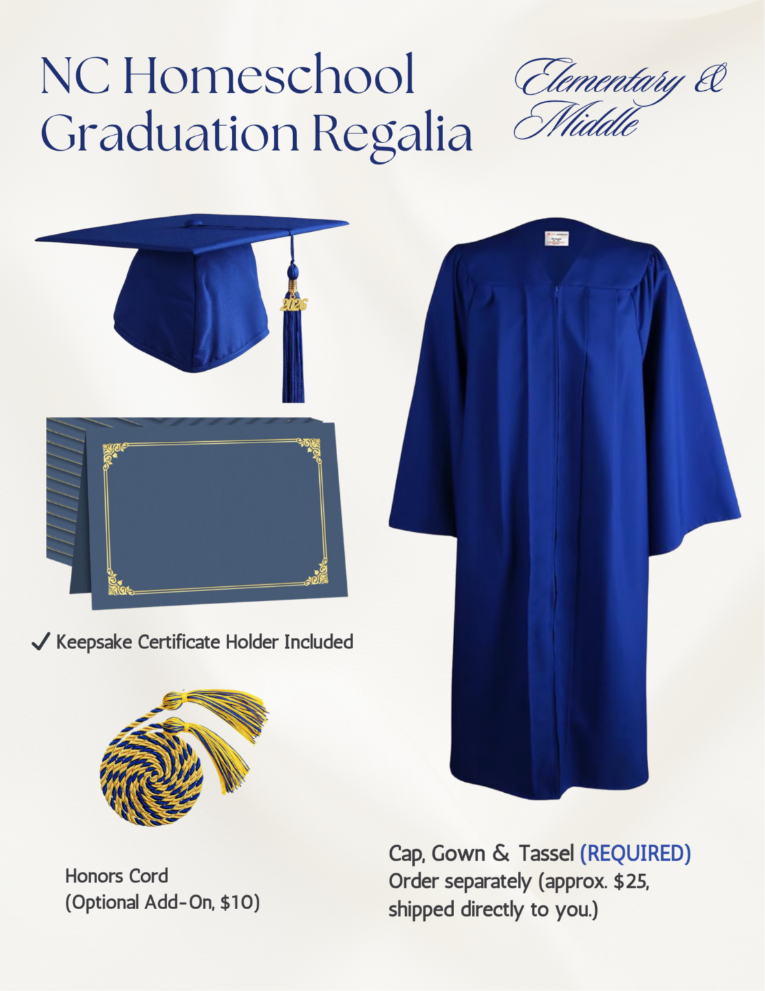 Cap, gown, and tassel are REQUIRED and NOT included (~$25). You will receive a link to order them upon checkout.
