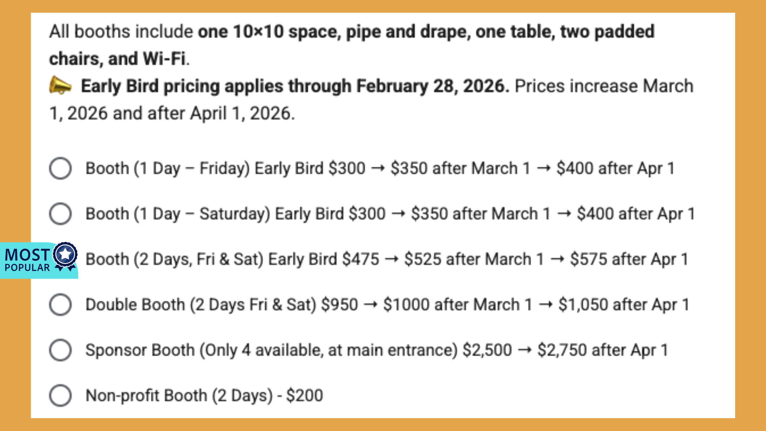 Early Bird Pricing ends March 1, 2026. Prices increase again on April 1, 2026. Reserve your booth early to lock in the lowest rate.